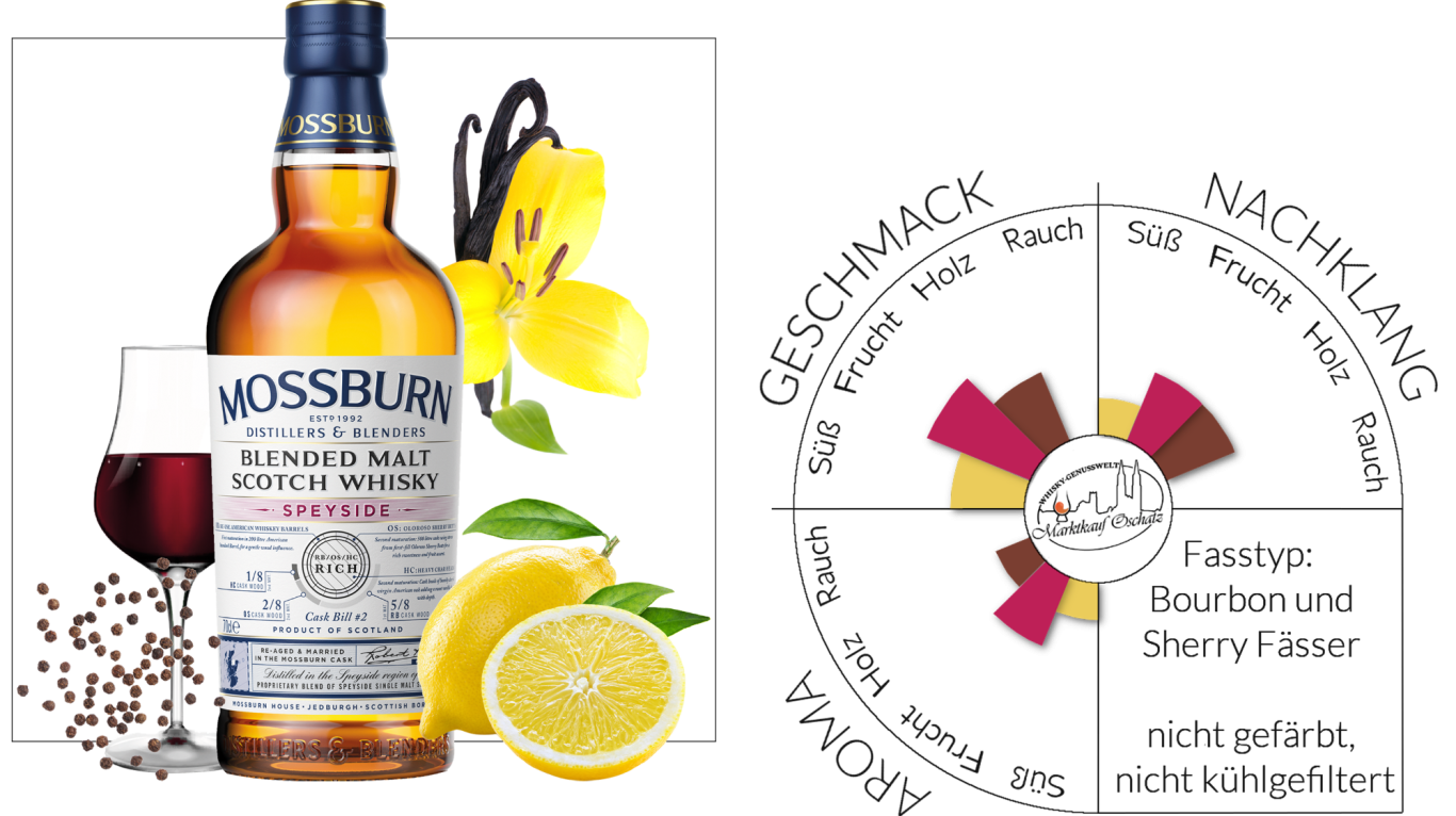 Würziger Speyside Blended Malt mit süßen Sherry Noten. Fruchtige Akzente mit getrockneten Pflaumen, Apfel & Birne, etwas Pfeffer und einem Hauch von Vanille mit Zitrus. Vollmundige Kombination aus Würze und Frucht.